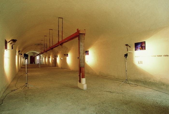 Gonzalo Díaz, ‘El padre de la patria’ (The Father of the Nation), tripods, spotlights, shelves, taxidermied birds, Roman numerals cast in bronze, cut vinyl lettering, photosilkscreened acrylic plaque, 5th Havana Biennial, 1994. Image courtesy of Archivo Gonzalo Díaz.
