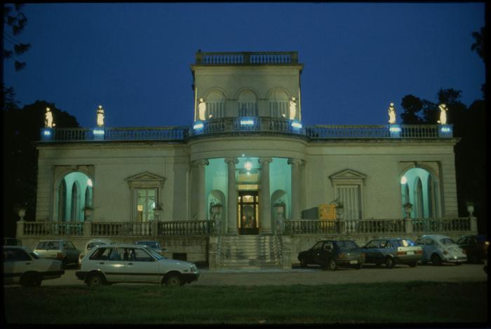 El jardín del artista (The Artist’s Garden, 1993) was a site-specific installation created by Díaz for the Museo de Bellas Artes Juan Manuel Blanes in Montevideo. Founded in 1930 to commemorate Uruguay’s Centenary of Independence, the museum holds an important collection of nineteenth- and twentieth-century national art. In this work Díaz intervened both the façade and interior of the museum, inserting neon text beneath the balcony sculptures and projecting imagery of Jardín de los Artistas, the garden surrounding the museum, into the exhibition hall.