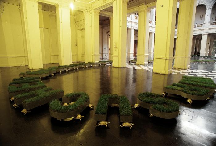 As for how to monumentalise a text, there’s the work with the turtles, made with grass—El tratado del Entendimiento Humano (The Treatise on Human Understanding, 2001). At the 51st Venice Biennale, in Muerte en Venecia (Death in Venice, 2005), something similar happened, too. The texts flicker with those oscillating machines that project the word in motion… it’s different from casting a word in lead or bronze, or painting it with stencils that I designed myself. It’s a more or less conscious exploration of efficient and specific ways of monumentalising a text.