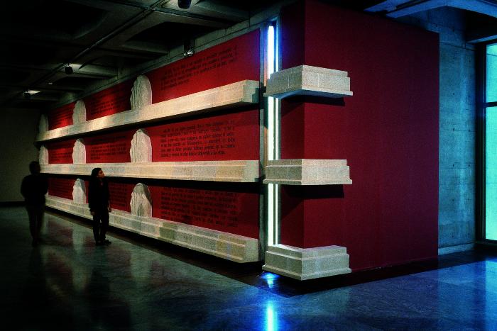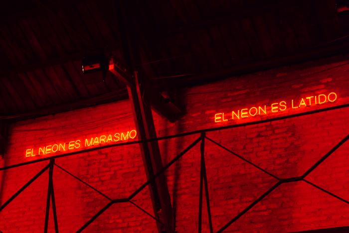 For two months, the title changed the name of the building. At night you saw nothing but Unidos en la Gloria y en la Muerte glowing in the dark. By day, the sun’s force made the neon disappear, as if it wasn’t there. Then you saw the lapidary inscription of the museum’s name carved in stone – the ‘stone’ in quotes, since it is stucco that only looks like stone.