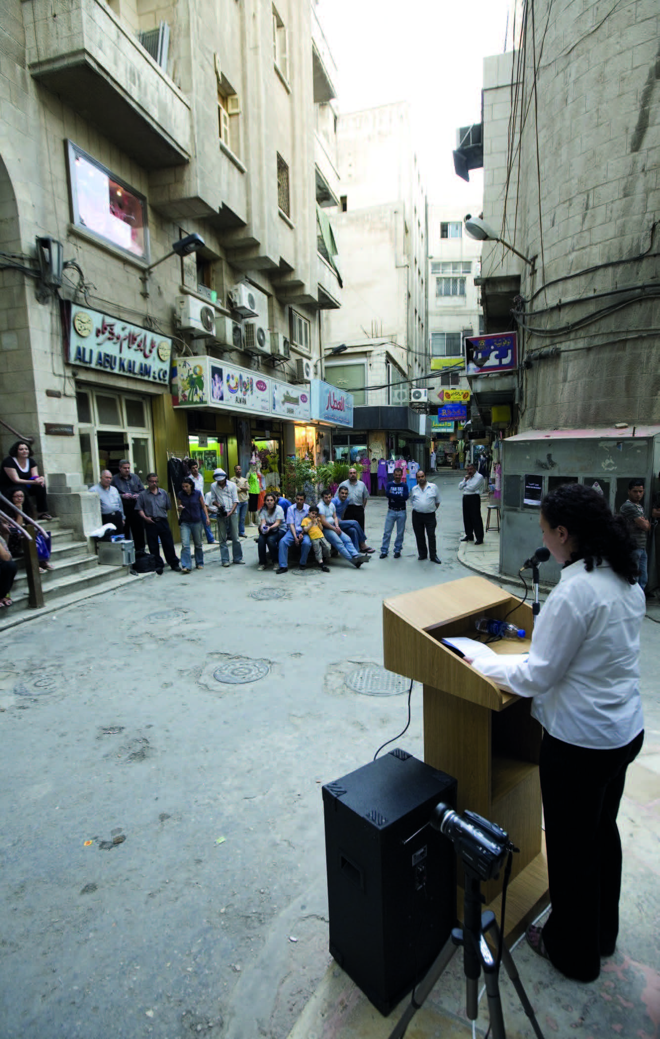 Projects like Where are the Arabs? might initially read like analogies to the better-known work of Western artists like Sharon Hayes, or as localised examples of a more global interest in re-enactment. However, to view Hijawi’s work in these terms would miss its most crucial element, namely, its engagement with the politics of what might be called the post-pan-Arab public sphere. Urban spaces like the ones in which Hijawi intervened, which became crucial sites of struggle during the occupations of the Arab Spring, are traversed by historically and culturally distinct determinants. These include Islamic doxa governing decorum and representation, along with the use of mosques as collective spaces; the legacy of colonial powers, which often used urban planning as a technology of control; the accelerated modernisation of the post-War era; the restrictions on speech and assembly imposed by authoritarian regimes; and the neoliberal tendencies toward privatisation and speculative development.09