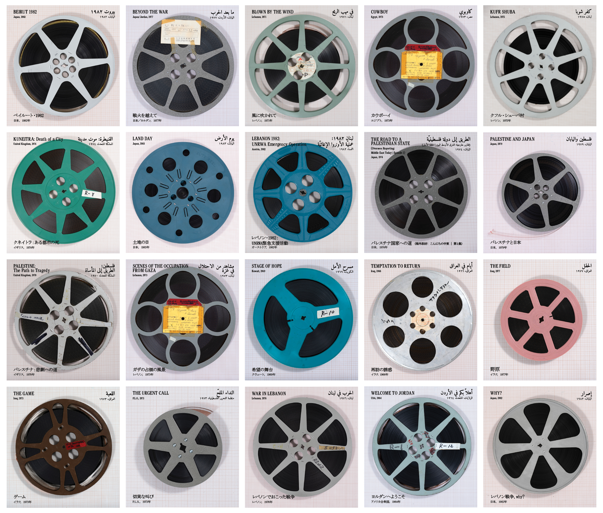 Five rows and four columns of perfectly aligned photographs containing film reels cover the landing page of the Tokyo Reels website. Each photograph is similar: each reel is laid on top of graph paper onto which it casts a slight shadow; on the top left of each photograph, we see the title of the film that the reel contains written in English, with the production country and year listed underneath; on the top right, the same information written in Arabic; on the bottom left, in Japanese. Upon closer inspection, the uniqueness of each photograph reveals itself: while the circular reel gives a graphical match between all the photographs, the support structure of each one of them offer variations on the familiar pattern; some of the films have warped with age and hang slightly loose on the reel; a few of the reels have notes taped onto them, yellowed with age and written in different languages; and several have notes directly written onto them with marker pen. Beyond what the films contain, the page seems to suggest the very existence of these reels is of paramount importance for their evidentiary quality as objects, which in themselves hold a history. The precision and uniformity of their display is almost military: is this a militant image, perhaps of an archival, distribution or screening operation?
