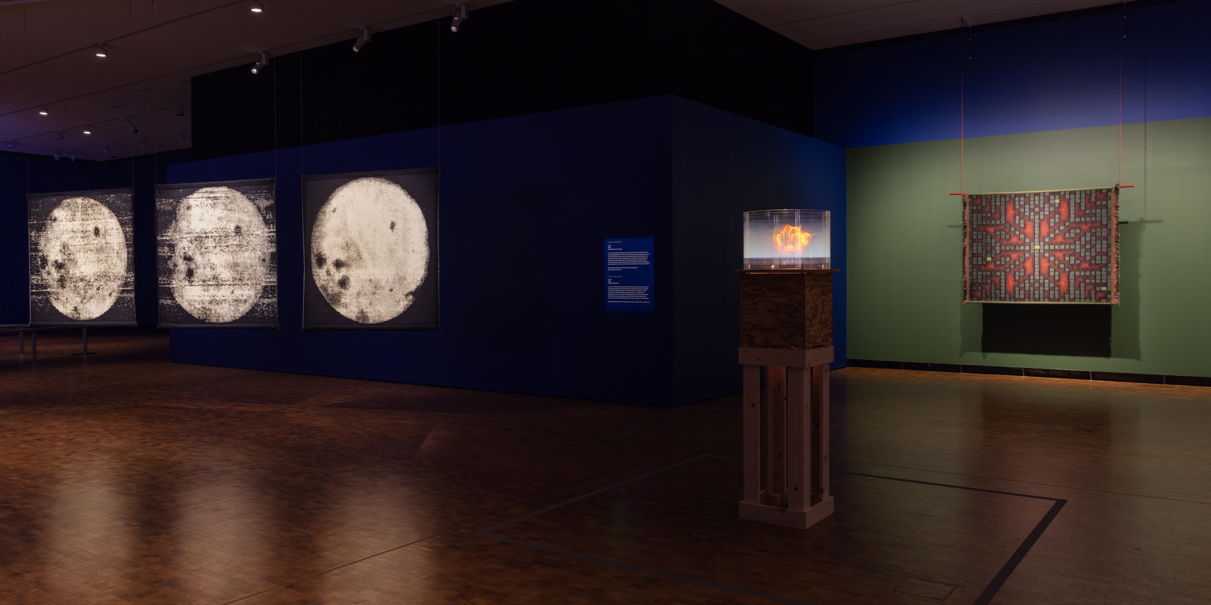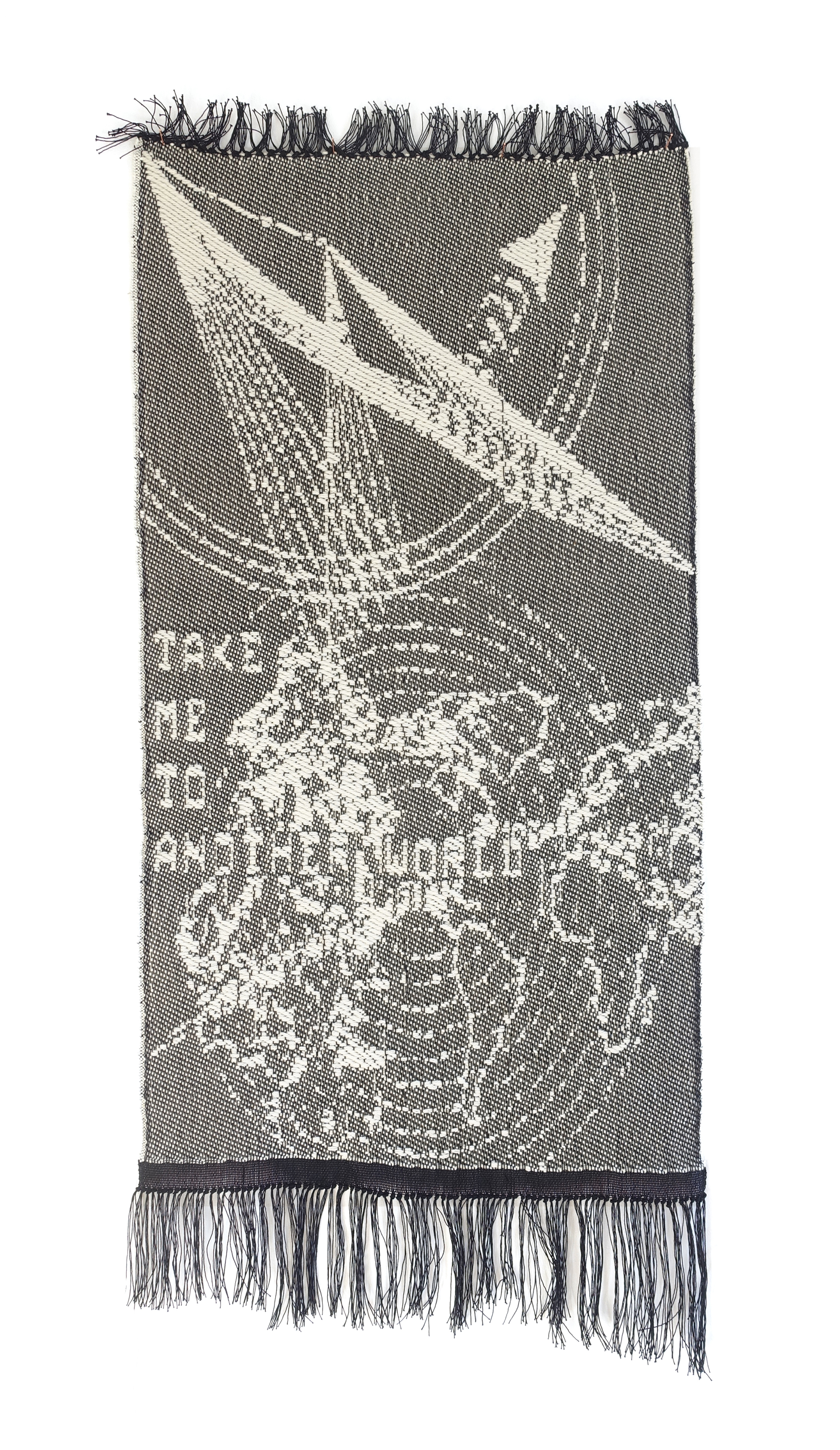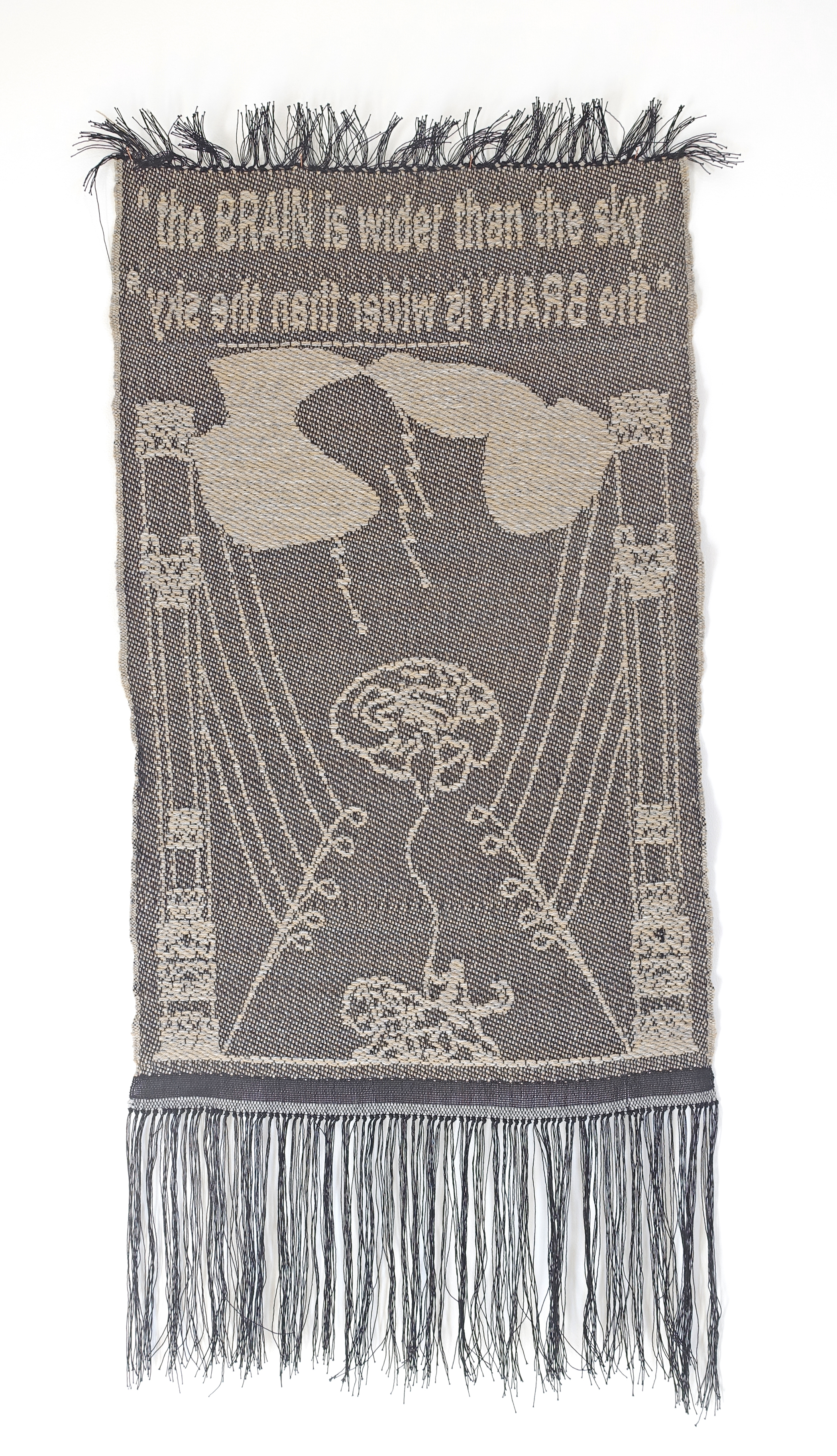 Elsewhere, historical material is digitally reworked or resituated. Ann Lislegaard’s anthropomorphic transformation of Yvonne Rainer’s Trio A02 translates an influential performance into a speculative distant future, while Charlotte Johannesson’s hand woven No Future (1977) appears less as a sovereign declaration of its moment than as a recurring condition. This persistence is underscored by the inclusion of her imposing Terror (1970; 2016), the later digitally woven The Brain is Wider Than the Sky (2019), as well as a series of digital graphics that together carry Johannesson’s concerns across changing technological contexts.
