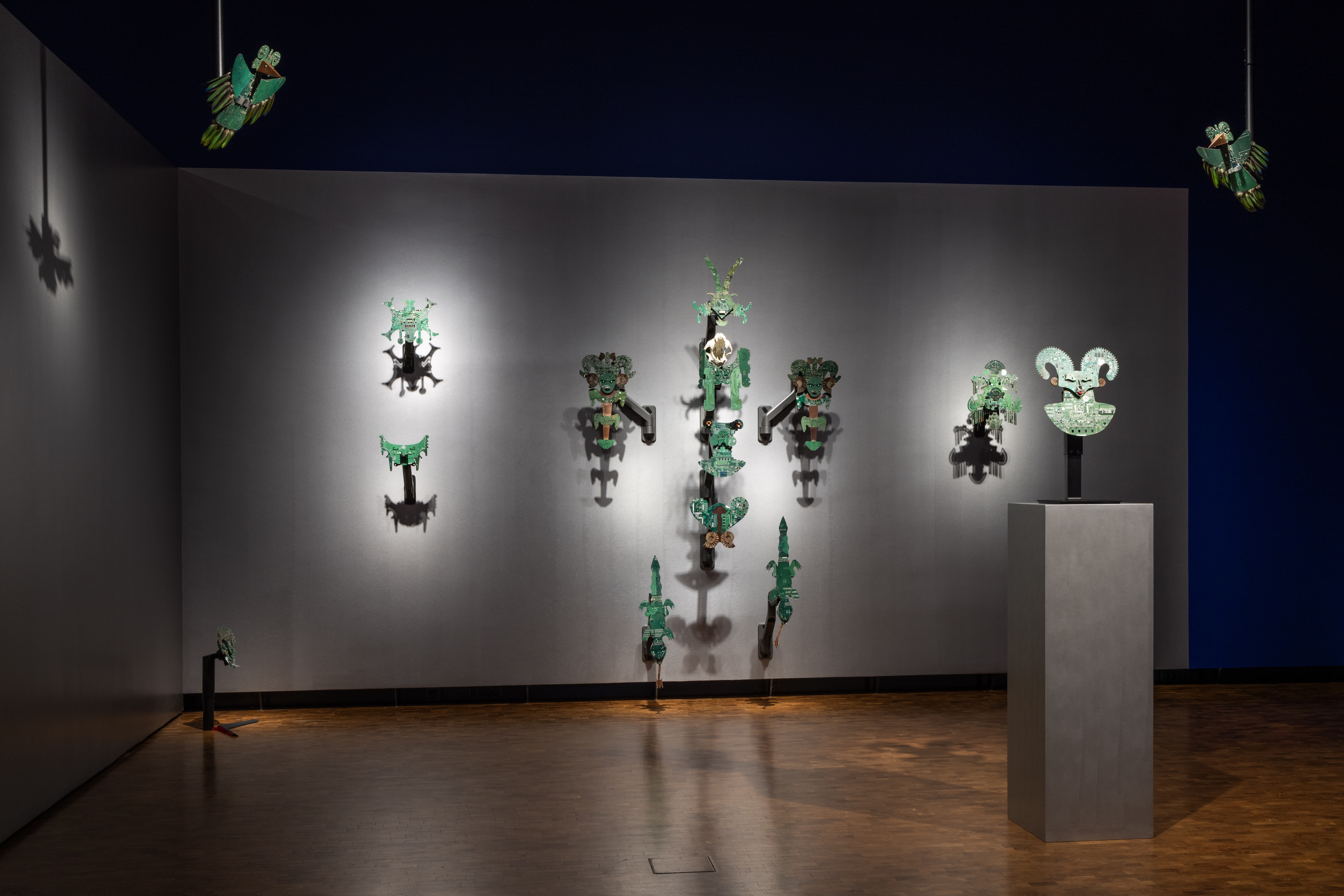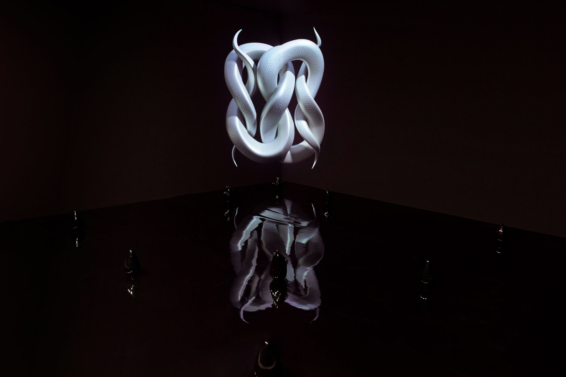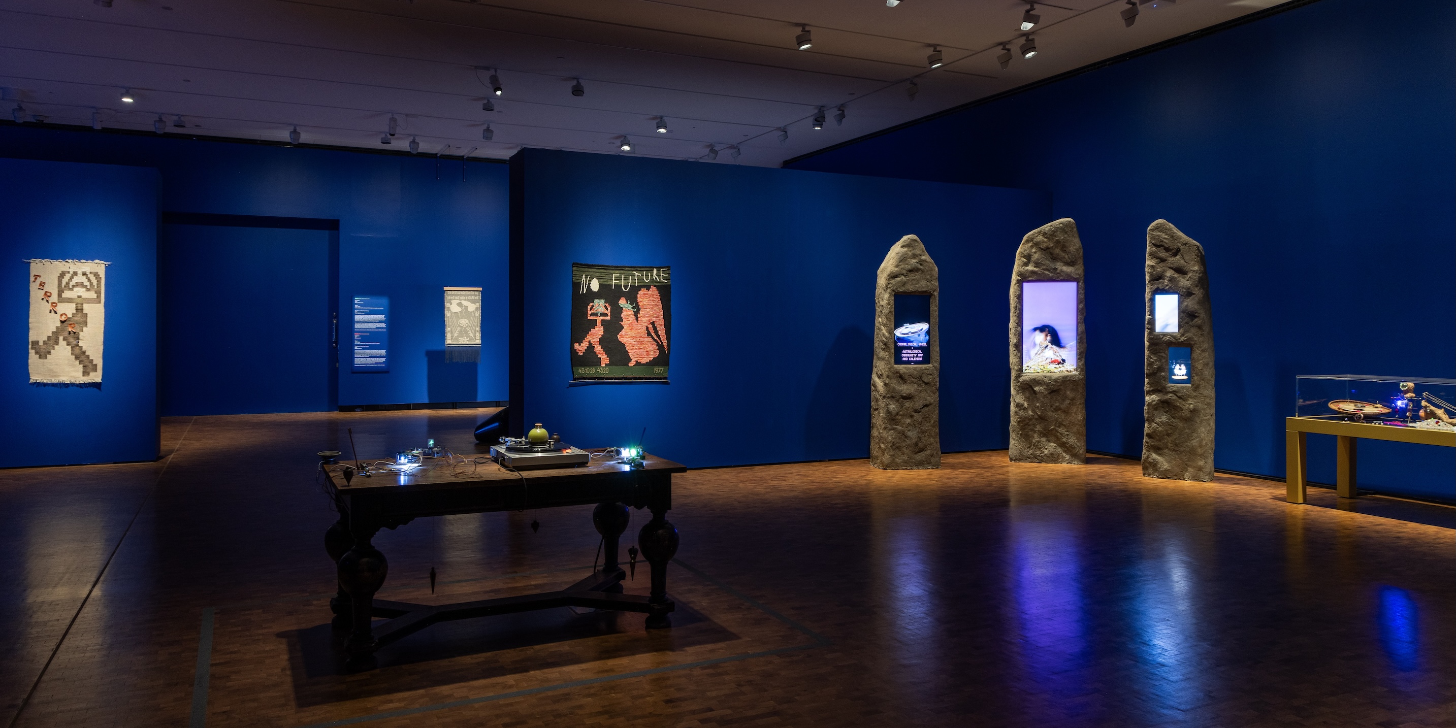 Other works approach technology through obsolescence, cosmology and mythology. Portals are built from ‘obsolete’ technologies in Natasha Tontey’s Macho Mystic Meltdown: Oikouménē (2025). By contrast, Mazenett Quiroga’s Technology of Enchantment / Enchantment of Technology (2025) articulates indigenous cosmologies through technological objects themselves, linking mineral mining in the Amazon to the extractivist infrastructures of digital culture. Set against a stellar grey backdrop, the work inverts the logic of the computer to expose its material entanglements. Emilija Škarnulytė turns instead to Baltic mythology, approaching cosmology less through circuitry than through water and geology, situating the Baltic Sea as a repository of layered histories that resist linear or extractive frameworks. Together, these works establish a complex set of temporal strategies that refuse dichotomous categorisation.